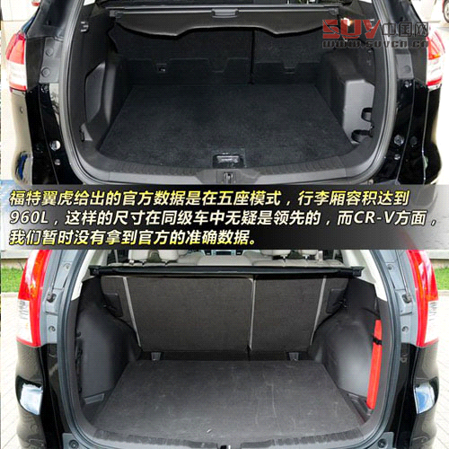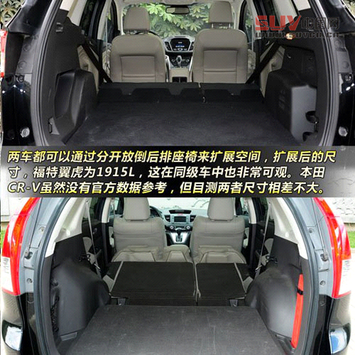 兩車都可以通過分開放倒后排座椅來擴展空間,擴展后的尺寸,福特翼虎為1915L,這在同級車中也是一個非常可觀的空間,這樣的容積應付一些搬運任務也是不在話下。本田CR-V放,同樣我們暫時沒有拿到官方數據,不過目測兩車的尺寸差不多。