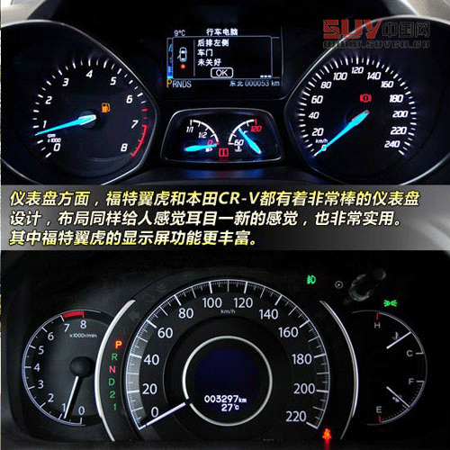 本田CR-V方面,則很特別的采用了多層次的儀表布局,由中間向外依次是行車電腦顯示屏、車速表、車輛狀況指示燈,以及左側是發動機轉速表,右側是水溫表和燃油存量,布局非常巧妙,尤其是車款指示燈的排布方式令人耳目一新。