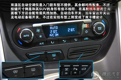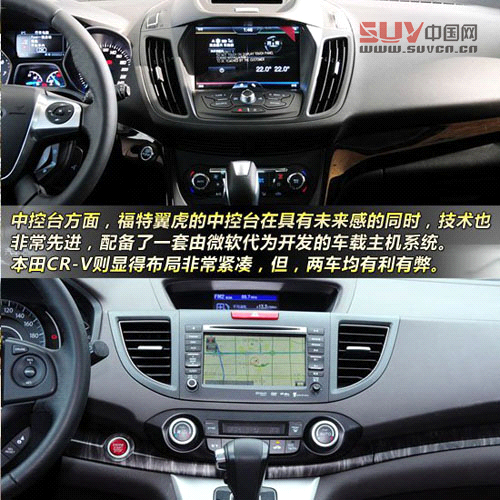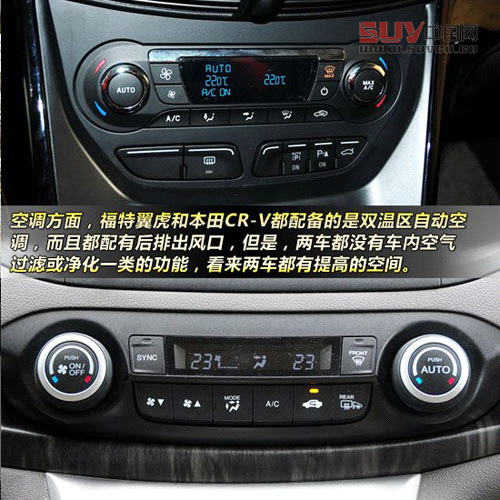 空調方面,福特翼虎和本田CR-V都配備的是雙溫區自動空調,而且都配有后排出風口,但是,兩車都沒有車內空氣過濾或凈化一類的功能,看來兩車都沒有跟上霧霾日益嚴重的城市的節奏。