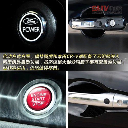 啟動方式方面,福特翼虎和本田CR-V都配備了無鑰匙進入和無鑰匙啟動功能,雖然這是大部分同級車都有配備的功能,但非常實用,仍然值得稱贊。