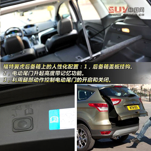 另外不得不提到福特翼虎的幾個人性化配置,第一是后備箱地板有一個掛鉤,可以懸掛于車體結實的部分,方便拿取蓋板下方的備胎等物品;第二是后備箱采用了電動尾門,開口較大,而且開啟高度可以記憶,對于身材不高或在地下車庫使用的人來說,電動尾門可以不開到最大角度的功能,非常實用;第三是用腿部動作可以開啟電動尾門,只需要將腿在后保險杠下方晃一晃,尾門就會打開,對于搬運重物的人來說非常實用。