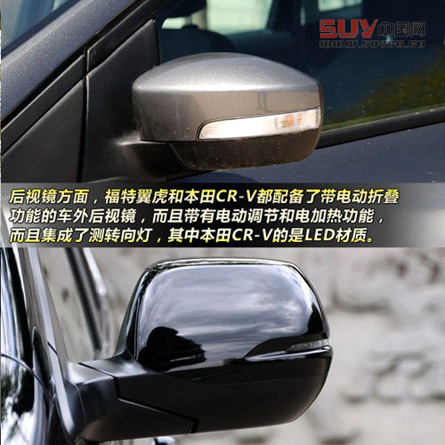 后視鏡方面,福特翼虎和本田CR-V都配備了帶電動折疊功能的車外后視鏡,而且帶有電動調節和電加熱功能,而且集成了測轉向燈。不同的是,本田CR-V的轉向燈為LED材質,更耐用而且更小巧。反過來,福特翼虎車內后視鏡帶有自動防眩目功能,扳回一局。