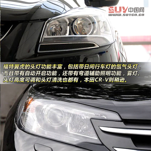 車頭方面,福特翼虎采用了雙層的進氣格柵造型,上層比較窄長,下層視覺上比較寬大,與兩側霧燈飾板形成大嘴的梯形造型,給整車增加了動感。頭燈的造型比較緊湊,但功能卻是非常強大,這一點容后再說。本田CR-V方面,進氣格柵與頭燈錯綜組合,顯得整體性非常強,而且也顯示出本田最自身制作工藝的自信,并且整體上,進氣格柵和頭燈營造出飛翼的造型,增強了車頭設計的靈動感。