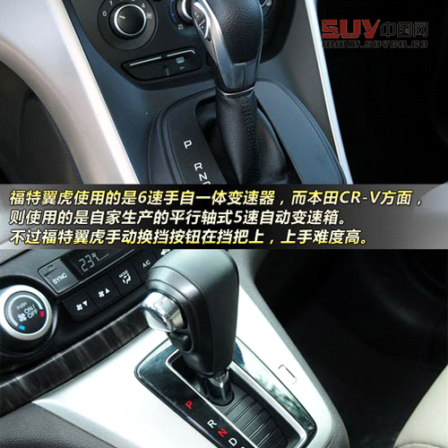 變速箱方面,福特翼虎使用的是6速手自一體變速器,而本田CR-V方面,則使用的是自家生產的平行軸式5速自動變速箱,在現在普遍使用6速變速箱的時代,本田CR-V的5速變速箱實在不占優勢。值得一提的是福特翼虎的擋桿設計,它的手動加減檔是通過擋把側向的按鈕完成,操作體驗感覺并不容易上手。