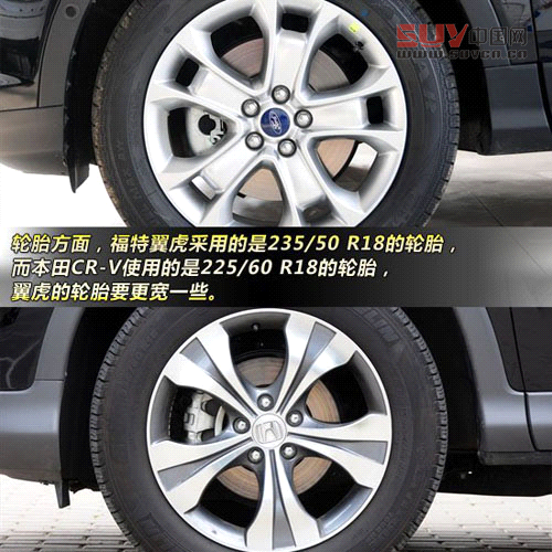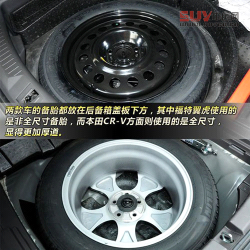 輪胎方面,福特翼虎采用的是235/50 R18的輪胎,而本田CR-V使用的是225/60 R18的輪胎,翼虎的輪胎要更寬一些,但我們共同認為,兩輛車的車身設計配合稍大一些尺寸的輪轂會顯得更漂亮。備胎方面,兩款車的備胎都放在后備箱蓋板下方,其中福特翼虎使用的是非全尺寸備胎,而本田CR-V方面則使用的是全尺寸,顯得更加厚道。