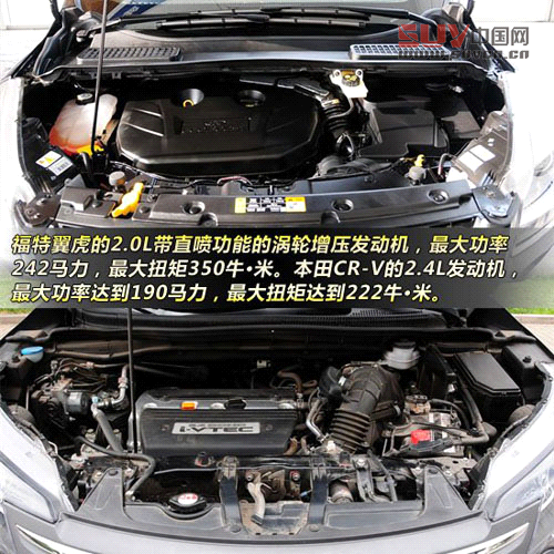福特翼虎的發動機采用的是2.0L帶直噴功能的渦輪增壓發動機,最大功率242馬力,最大扭矩350牛·米,而且只需要使用93#汽油(京92#),參數方面可謂非常亮眼。本田CR-V的發動機采用的是2.4L自然吸氣發動機,在i-VTEC功能的幫助下,最大功率達到190馬力,最大扭矩達到222牛·米,同樣使用93#汽油(京92#),這樣的參數作為2.4L自然吸氣發動機同樣非常出色。