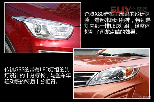 車燈方面,奔騰X80借鑒了鷹眼的設計靈感,看起來炯炯有神,特別是燈內那一排LED燈組,給整體起到了畫龍點睛的效果。而傳祺GS5的帶有LED燈組的頭燈則更顯修長,讓進氣格柵看起來也有伸展的效果;值得注意的是,傳祺GS5全系標配頭燈自動開閉、延時關閉和照射范圍調整功能,這是奔騰X80不所具備的。