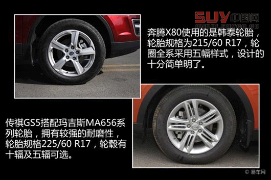 傳祺GS5搭配瑪吉斯MA656系列輪胎,擁有較強的耐磨性,輪胎規格225/60 R17,輪轂有十輻及五輻可選。X80為韓泰MX656輪胎,在噪音控制及舒適性方面有著不錯的表現,輪胎規格為215/60 R17,輪圈全系采用五幅樣式,整體給人感覺簡單明了。
