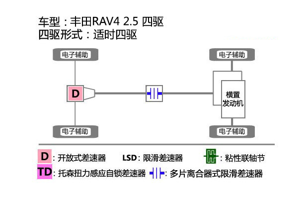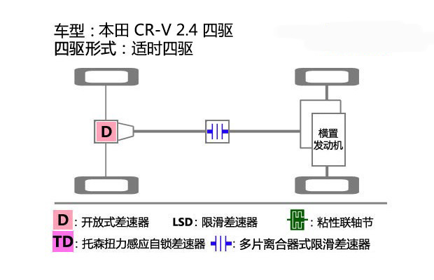 從結構上講,新RAV4的四驅系統依然是以多片離合器作為中央差速器,以前驅為主的適時四驅系統,不過它的響應速度和扭矩分配邏輯做了提升,增加了新的動態扭矩控制技術(DTC)。CR-V的四驅系統在2013年年中時全部更換為E-DPS電控智能適時四驅系統,相比之前使用的雙泵式適時四驅,升級后的四驅系統由電子系統主動控制中央多片式離合器,前后扭矩分配比例可達到50:50(之前雙泵式最大僅為70:30)。當然,新四驅系統的主要功能還是提高公路行駛時的扭矩分配效果,越野、脫困依然不是它的強項。
