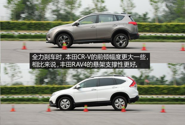 兩款車在全力剎車時都出現了明顯的前傾,不過相對來說CR-V的前傾幅度更大一些,而RAV4的懸架支撐性較好。RAV4的不足是剎車踏板前段腳感有點空曠,剎車力度掌握需要一段時間適應,必須更多的踩下踏板才能獲得足夠的制動力。最終成績RAV4為40.71米,屬于優秀范疇,而CR-V更加出色,平均成績僅為39.8米,對于一輛SUV來說值得肯定。
