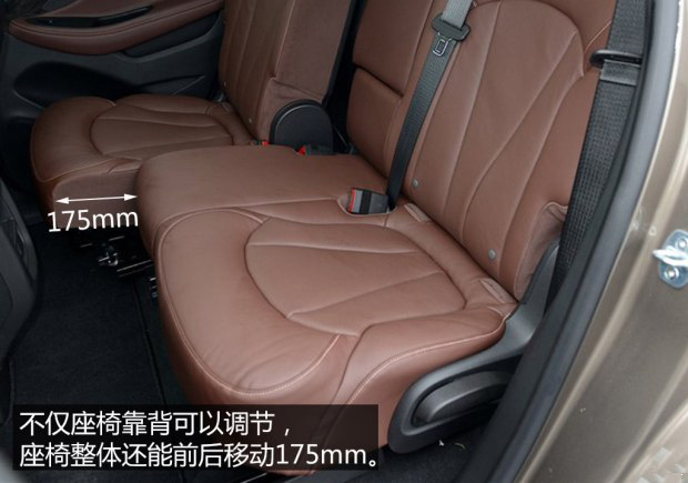 昂科威后排具有獨立出風口,后排座椅也可以前后調節,前后調節距離175mm,能夠充分利用車內空間。在后排座椅移動到最后時,腿部有近3拳的空間,表現不錯。
