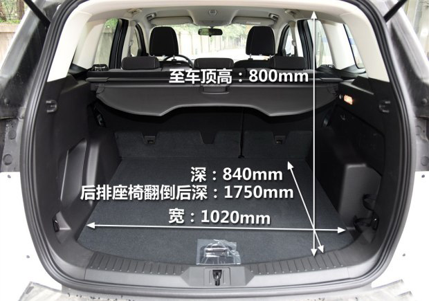 后備廂是翼虎的一個亮點,官方提供的數據顯示:常規后排不翻倒狀態下它具有960L的容積,翻倒后排之后它的后備廂容積為1915L,后備廂空間表現不錯。