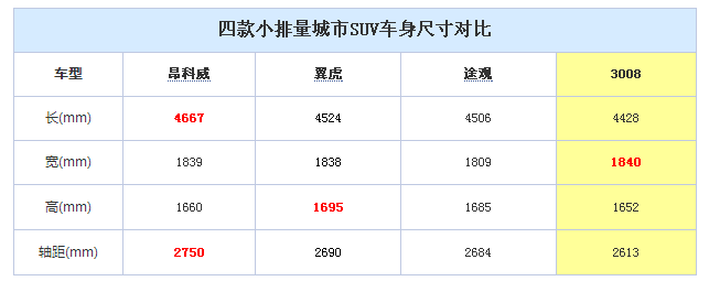尺寸方面,3008并不占優,車長和軸距方面都是本次推薦的車型中最小的。不過3008具有1840mm的車身寬度,比另外三位對手都要寬,整體的視覺效果比較出色。當然,車身尺寸也制約了它在車內空間表現上的發揮。