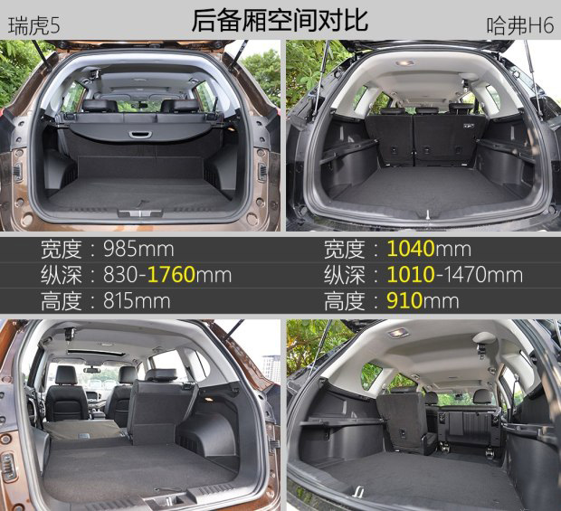 在前排乘坐空間方面,兩車的表現都讓人滿意。而在后排乘坐空間方面,兩車則就各有特長,頭部空間方面瑞虎5明顯優于哈弗H6,而在腿部空間方面兩者的優劣勢卻反過來。