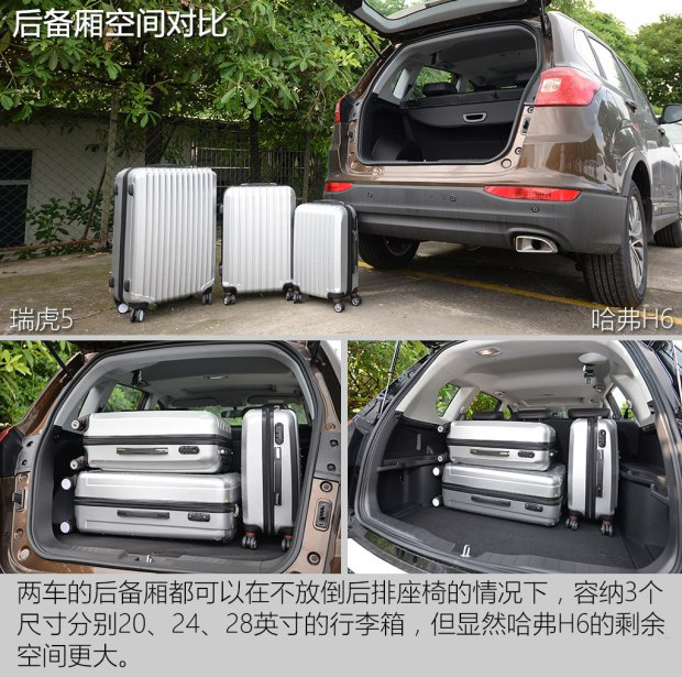 來到后備廂,哈弗H6再次發揮車身尺寸帶來的優勢,后備廂容積明顯拋離瑞虎5,尤其是在不放倒后排座椅靠背的情況下,放進3個行李箱依然還有寬裕的空間。
