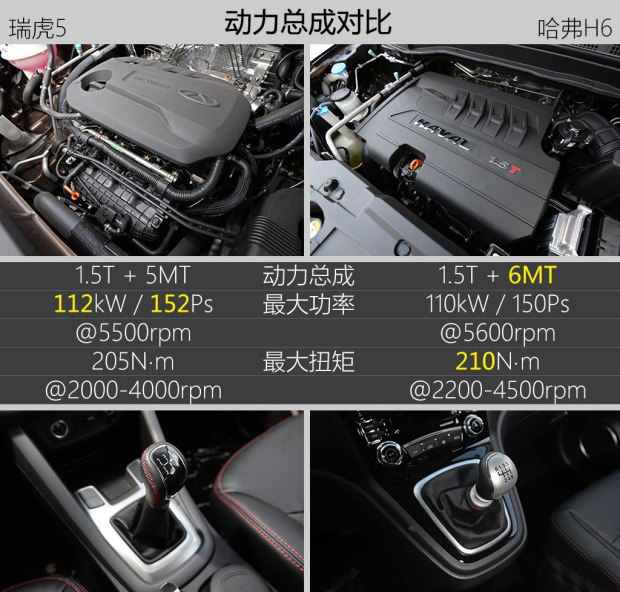 本文對比的兩款車型都配備1.5T發動機,參數上差異不大,瑞虎5功率稍高一些,而哈弗H6則扭矩大一些。真正有實際差異的地方是變速箱,瑞虎5配備的是5MT,哈弗H6為6MT。