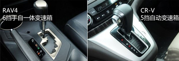 變速箱環節,新RAV4換裝了6擋手自一體變速箱,它的手動模式比較特別,采用了限制擋位的設計。比如你將擋位設為“4”,則變速箱便只會在1-4擋之間切換。相比來說CR-V就簡單多了,依然是自家的那臺平行軸結構5擋自動變速箱,沒有什么特別的功能。