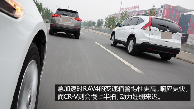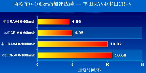兩款車的動力都屬于正常水平,起步時車輪都沒有明顯打滑,整個加速過程也相對平穩。不過由于RAV4更靈敏的油門響應使得它在起步階段就領先了本田CR-V,并且一直保持到100km/h。最終RAV4的成績為10.02秒,CR-V的成績為10.68秒,這兩個成績在同級別中都屬于比較好的。