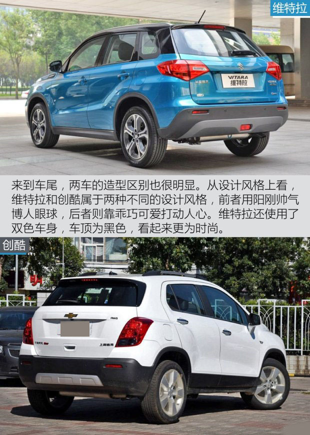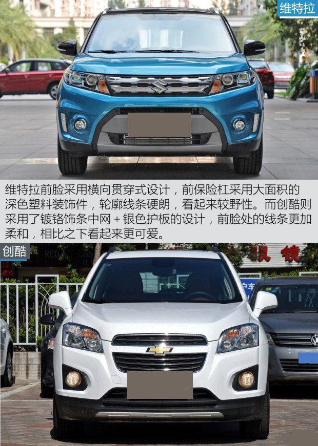 維特拉和創(chuàng)酷都采用黑色車(chē)身包圍設(shè)計(jì),前者采用黑色塑料和大面積的深灰色的下部裝飾板,后者則采用黑色塑料包圍加上小面積的銀色裝飾板。在設(shè)計(jì)上都屬于當(dāng)下流行的SUV車(chē)型設(shè)計(jì)方案,觀(guān)感上各有千秋。