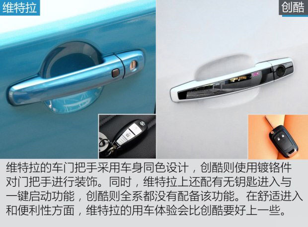 外后視鏡電動(dòng)折疊以及無(wú)鑰匙進(jìn)入和一鍵啟動(dòng)功能在維特拉豪華型以及以上車(chē)型均有配備,因此本次參與對(duì)比的維特拉比創(chuàng)酷多了這兩樣配置。從舒適性和便利性方面來(lái)看,會(huì)比創(chuàng)酷好上一些。