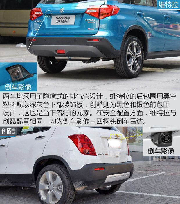 購(gòu)買(mǎi)這兩輛車(chē)的消費(fèi)者對(duì)外觀(guān)的喜好會(huì)分成兩個(gè)陣營(yíng),因?yàn)檫@兩輛車(chē)的車(chē)尾造型風(fēng)格同前臉一樣處于一個(gè)對(duì)立位置:維特拉走的是時(shí)尚硬朗的路線(xiàn),創(chuàng)酷則依然圓潤(rùn)可愛(ài)。這一點(diǎn)在尾燈的造型上也可以看出,維特拉的采用輪廓硬朗的分體式尾燈,并加入了更多的LED光源凸顯時(shí)尚感。創(chuàng)酷上市之后對(duì)尾燈配置方面并未進(jìn)行升級(jí),仍然使用全鹵素光源。
