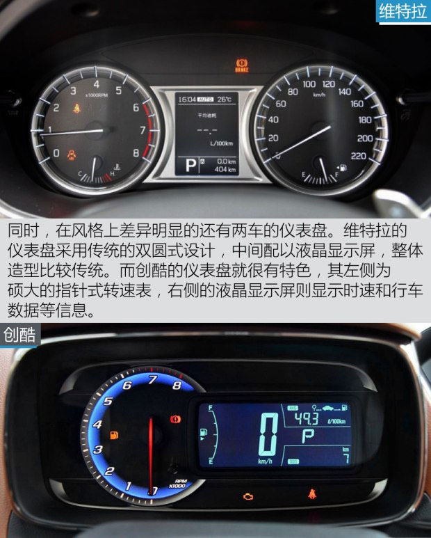 儀表盤(pán)也是一樣,在維特拉的儀表盤(pán)上兩塊實(shí)體表盤(pán)分列兩側(cè),中央為一塊行車(chē)電腦的液晶顯示屏,看起來(lái)較為傳統(tǒng)。創(chuàng)酷則采用了一塊巨大的液晶屏取代左側(cè)傳統(tǒng)的時(shí)速表盤(pán),看起來(lái)更為時(shí)尚,也更有科技感。