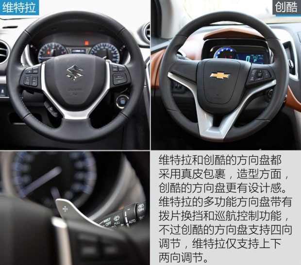 維特拉配備有撥片換擋功能,而且相比創(chuàng)酷,通過(guò)它的多功能方向盤(pán)還能控制更多的車(chē)載系統(tǒng),如創(chuàng)酷不具備的定速巡航以及CarPlay功能。再看創(chuàng)酷,它的方向盤(pán)為四向調(diào)節(jié),能夠適應(yīng)不同體型的駕駛者,配置更為人性化。