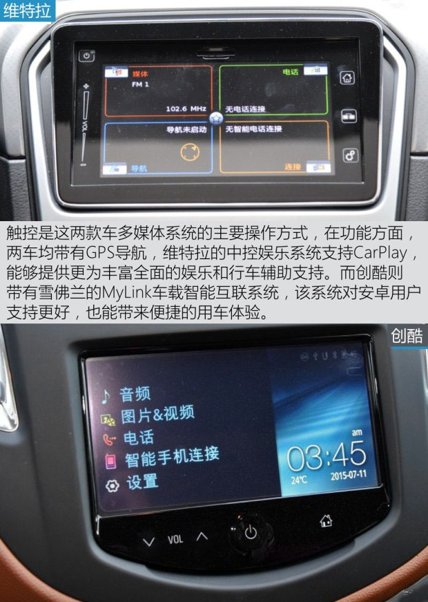 這兩款車(chē)都配有帶觸控功能的中控顯示屏,并帶有GPS導(dǎo)航功能,屏幕上的操作便利程度不相上下。不過(guò)維特拉配備了這一級(jí)別車(chē)型中不多見(jiàn)的CarPlay功能,通過(guò)它能夠提供更加豐富便利的娛樂(lè)和行車(chē)輔助功能。雪佛蘭的MyLink車(chē)載智能互聯(lián)系統(tǒng)在創(chuàng)酷上也有所配備,這套系統(tǒng)對(duì)安卓用戶(hù)的支持程度更高,而且創(chuàng)酷還帶有安吉星功能。對(duì)于使用蘋(píng)果手機(jī)的用戶(hù),顯然維特拉帶有的CarPlay更好用,不過(guò)創(chuàng)酷上的MyLink+安吉星系統(tǒng)則可以照顧到更多的安卓用戶(hù),因此總體而言創(chuàng)酷的車(chē)載娛樂(lè)系統(tǒng)使用的便利性也不會(huì)差上多少。