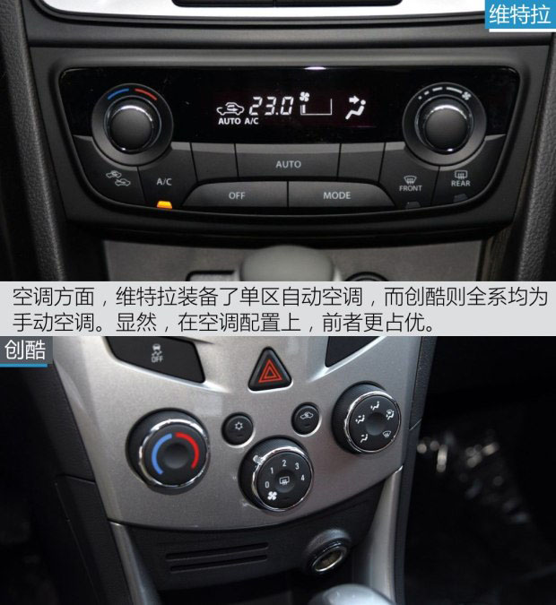 創(chuàng)酷目前配備的還是手動(dòng)空調(diào),在現(xiàn)在看來(lái),旗艦版車(chē)型配以這樣的配置有些說(shuō)不過(guò)去。所以相比起來(lái),維特拉上的單溫區(qū)自動(dòng)空調(diào)在舒適性上會(huì)更高一些。