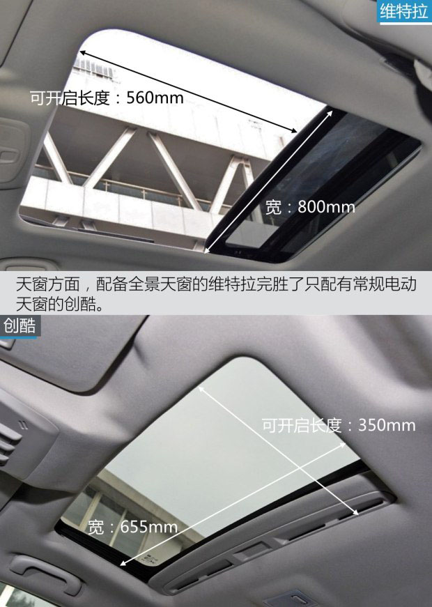 天窗的情況也是如此,維特拉配備了尺寸巨大的全景天窗,而創(chuàng)酷配備的則是常規(guī)的電動(dòng)天窗。
