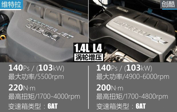 原因:兩款車(chē)配備的發(fā)動(dòng)機(jī)均為1.4T渦輪增壓發(fā)動(dòng)機(jī),動(dòng)力參數(shù)上很相近,發(fā)動(dòng)機(jī)最大功率相同,只是維特拉發(fā)動(dòng)機(jī)的扭矩比創(chuàng)酷高上了一點(diǎn)(20N·m)。