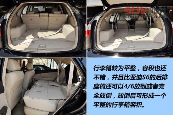 比亞迪S6車身大氣,整車尺寸4810*1855*1680mm,軸距達到了2720mm。無論是前后排頭部與后排腿部空間而言,都是十分的寬敞。雖然465升的行李廂容積不算特別出眾,但其深度和寬度還是很不要錯的,如果放倒后排的話,這個載物空間是令人滿意的。