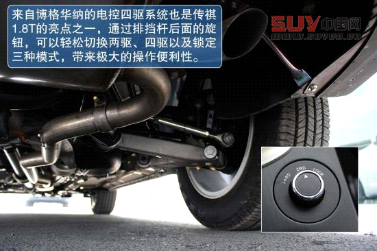 作為保持越野本質(zhì)的SUV,榮威W5的四驅(qū)系統(tǒng)由知名的博格華納提供,鏈條傳動式分動箱通過電控系統(tǒng)來進行后驅(qū)和四驅(qū)的轉(zhuǎn)換,掛入四驅(qū)后,前后軸為硬性連接,扭力分配50:50。分動箱帶有低速齒輪可將扭矩放大兩倍輸出。前后軸使用開放式差速器,四輪通過ABS實現(xiàn)電子限滑功能。和一般的適時四驅(qū)不同,榮威W5采用了標(biāo)準(zhǔn)的分時四驅(qū),不僅沒有離合片打滑的擔(dān)憂,并且低速四驅(qū)時,扭矩可以放大2倍,完全可以滿足常見野外的脫困需要。