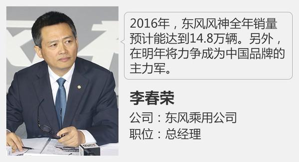 談及東風(fēng)風(fēng)神目前的市場表現(xiàn)以及今年全年的期望,李春榮表示:“截至11月底,東風(fēng)風(fēng)神此前制定的13萬輛銷售目標(biāo)已經(jīng)達(dá)成,2016年全年銷量預(yù)計能完成14.8萬輛左右,力爭突破15萬輛。同時,東風(fēng)風(fēng)神在明年將力爭成為中國品牌的主力軍。”