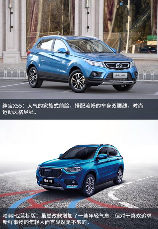 對于很多年輕家庭來說,當(dāng)兩口之家增添了新成員之后,對車的需求肯定會有所改變,在這種情況下,SUV憑借著時(shí)尚大氣的造型,寬大的空間等優(yōu)勢很容易對他們產(chǎn)生不可抗拒的吸引力。然而面對市場上眾多的品牌,如何挑出最適合自己的那一款,相信不少人都會為此犯上選擇障礙癥。為避免將有限的時(shí)間和精力浪費(fèi)在無限的糾結(jié)之上,今天小編特意為那些持幣待購的朋友們挑選了兩款熱門車型——紳寶X55和哈弗H2藍(lán)標(biāo)版,并根據(jù)年輕家庭的需求和喜好,從外觀、空間、配置等方面對它們做一個(gè)對比,看看兩者當(dāng)中,誰才是這些年輕家庭的最優(yōu)之選。
