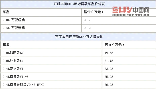| 產品名稱 | 2012款 CR-V 2.0兩驅都市版 | 2013款 CR-V 2.0L 兩驅經典版 | 2012款 CR-V 2.0四驅經典版 |