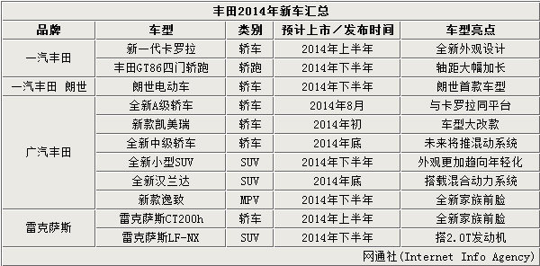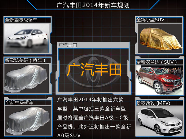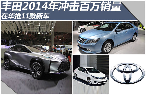 豐田在今年推出了致炫、新威馳等一系列新車,即將到來的2014年豐田同樣不會減小在華的新產品投放力度,對此豐田中國執行副總經理董長征表示:明年會推出多款新車,豐田在華銷量計劃將達到100萬輛。除了廣汽豐田進一步實施小型車戰略規劃外,一汽豐田合資自主品牌——朗世也將推出旗下首款車型,豐田在華將有多達11款新車密集發布。