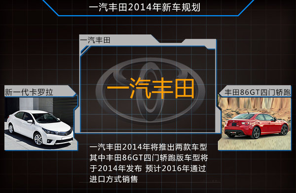 一汽豐田2014年新車規劃中,豐田86GT四門轎跑也將推出,預計2016年通過進口渠道正式開始上市銷售。而全新一代卡羅拉也將于上半年與消費者正式見面。新車采用了新的設計,軸距更是達到了2700mm,預售價在12萬元左右。