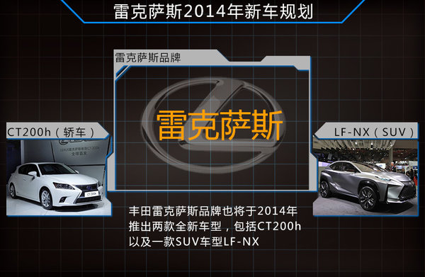 最后,豐田旗下主打高端品牌的雷克薩斯也將于2014年推出兩款車型,其中,雷克薩斯入門級SUV“LF-NX概念車”將于明年三月舉行的2014日內瓦車展中正式發布量產版本,預計將于2014年第二季度正式上市,未來將引進國內。而新款CT200h也剛于第十一屆廣州車展上與消費者見面,該車與老款一樣,將以進口方式引入國內市場,百公里4.6升油耗的混合動力系統將使得該車頗具看點。