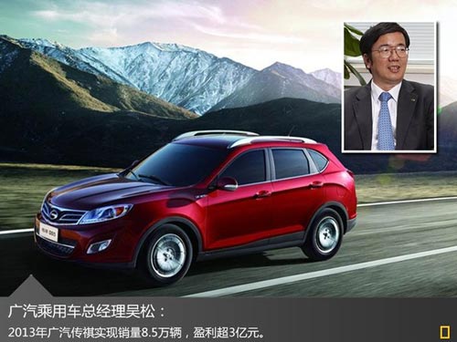 2014年上班第一天的1月2日,帶著新發型的廣汽乘用車總經理吳松出現在網通社等部分媒體面前,顯得特別有型和高興。當然,他的高興是由衷的,因為在剛過去的2013年,廣汽乘用車旗下傳祺品牌表現優異:8.5萬輛的銷量不僅比2012年3.3萬輛的銷量增長160%,更重要的是,2013年年實現了超過3億元的盈利。在2014年、2015年兩年間,將陸續推出8款新車,到2015年,產銷規模也將挑戰25萬輛目標。