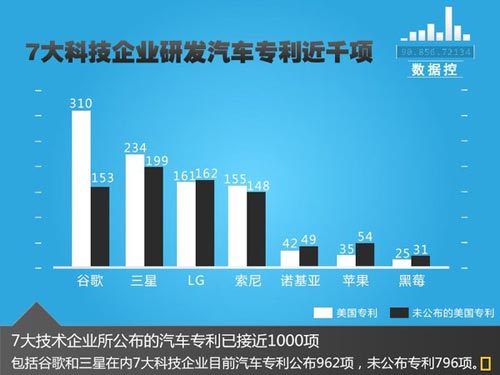 目前包括谷歌、三星、LG、索尼、諾基亞、蘋果以及黑莓在內(nèi)的7家廠商,已在美國申請并公布了962項設(shè)計汽車領(lǐng)域的專利技術(shù),其中大部分涉及車載導(dǎo)航應(yīng)用、新能源汽車和電動車型驅(qū)動等方面。而在上市科技企業(yè)中谷歌共擁有310項已公布的專利項目和153項尚未公布的專利技術(shù),其也成為了在汽車領(lǐng)域研發(fā)專利最多的IT企業(yè)。