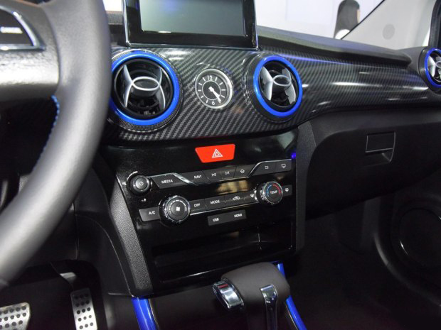 內飾方面,昌河Q25采用了較多的年輕化設計,大面積的仿碳纖維內飾板配合藍色飾條進一步凸顯了運動感。在中控臺上方配有可折疊式的多媒體顯示屏,并在空調出風口處融入了昌河汽車品牌LOGO。