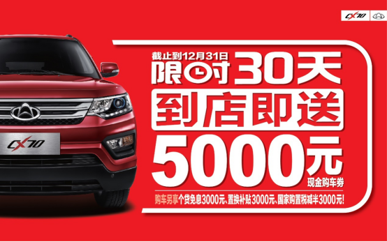 不過,CX70本著驚喜不嫌少的原則,在12月這個年底虐心虐狗的收官之際,送給你“到店即送5000元現金購車券”的年終大獎。再加上個人免息3000元、置換補貼3000元、國家購置稅減半3000元的三重驚喜大禮。分分鐘特惠14000絕對不是炒作,當然了機會都是留給有準備的人的,尤其是對于長安CX70這種性價比走天下,一心做質量的車型。絕對機不可失失不再來,時間有限僅僅30天,不要以為12月有31天就可以肆無忌憚,CX70只給你30天,過期不候!敞開想想,本月不下手,到下個月價格回歸,你得多花一整套豪華裝飾的錢來買裸車,下個月的置換補貼3000元也沒有了,哪個更劃算,仔細算一算。