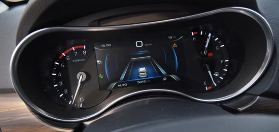 方向盤足夠粗壯也足夠大,很符合車輛的定位,同時真皮包裹比較細膩,手感不錯。儀表盤進行了升級,中間加入了一個大尺寸的彩色液晶屏,能夠顯示豐富的行車信息,畫面也一點都不山寨,提升了車內的科技感。