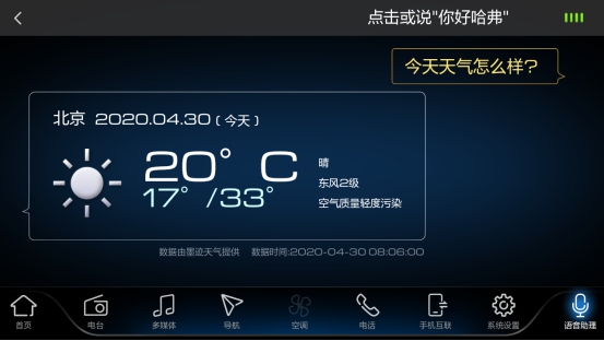 同時,哈弗H6運動版還能和你語音互動,其搭載的智能互聯(lián)系統(tǒng)集成了語音識別功能,基于定制化的科大訊飛語音助手3.5系統(tǒng)打造而來,可通過語音控制多媒體、導航、空調、電話等,并且還能查詢火車票、航班、天氣等信息。重要的是,它還支持全局免喚醒,例如“我想查詢北京的天氣”,系統(tǒng)就會語音播報天氣情況。