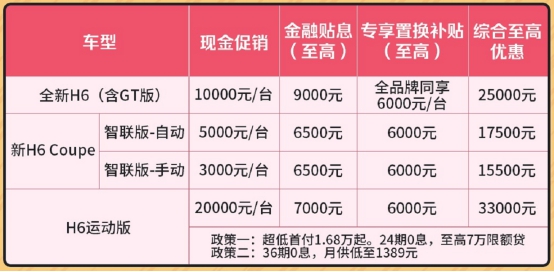 在原本足夠親民的售價基礎上,哈弗H6還帶來了非常超值的神車抄底優惠政策,包含現金優惠、置換優惠以及金融政策三大促銷福利,購車驚喜不斷。近期,購買全新哈弗H6(含鉑金版和GT版),可享受綜合至高25000元的購車優惠,同時購買新哈弗H6 Coupe和哈弗H6運動版分別可享受綜合至高17500元以及33000元的購車優惠,輕松滿足你對高品質SUV的向往。截止7月31日,在優惠購車政策的基礎上,消費者還可享受9.9元抵2000元(全新哈弗H6、新哈弗H6 Coupe)或1000元(哈弗H6運動版)的電商優惠政策。如此給力的抄底優惠,還不趕快搶購?