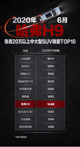 6月銷量1448臺,穩居20萬以上中大型SUV銷量TOP10,問鼎在產中大型硬派SUV銷冠;上半年累計銷量7286臺,躋身國內中大型SUV銷量TOP5,穩居在產中大型硬派SUV冠軍……一連串的高光數據,源自哈弗H9的硬核實力。