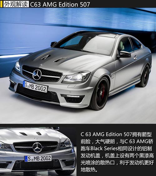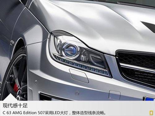 高光黑色 的后備箱蓋上的擾流板、擴散器、水箱和日間行車燈邊框等,配上暗色系的前車燈,以及側門檻梁板上方采用的啞光石墨灰色AMG運動條紋設計,為整車增添了非 常獨特的運動氣息。此外,C 63 AMG Edition 507還新增了designo magno鉑金色外觀,采用了啞光烤漆工藝,非常搶眼。