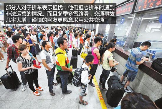 在所有調(diào)查者中,有接近40%的網(wǎng)友對于拼車表示擔(dān)憂。他們擔(dān)心拼車時遇到非法運營的情況,從而無法保障自身合法權(quán)益。另外,由于冬季多雪路滑,再加上回家車輛較多,路上難免出現(xiàn)大大小小的交通事故。所以謹(jǐn)慎的網(wǎng)友認(rèn)為公共交通更加靠譜,他們寧愿加價買車票,或是推遲回家時間,也不愿意承擔(dān)拼出帶來的風(fēng)險。