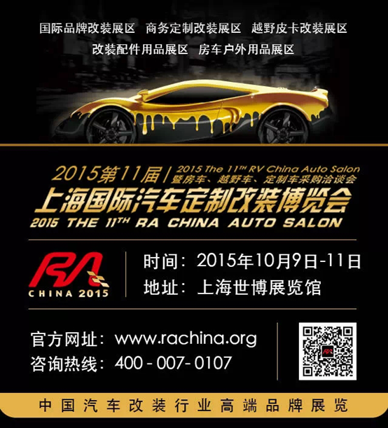 金秋十月, 2015年第十一屆RA上海國際汽車定制改裝博覽會定于2015年10月9日至11日舉辦,展期三天,將啟用上海世博展覽館2號館全館及館外場地,總面積達到30000平方米。分設五大展區:國際品牌改裝展區、商務定制改裝展區、越野皮卡改裝展區、改裝配件用品展區、房車戶外用品展區。